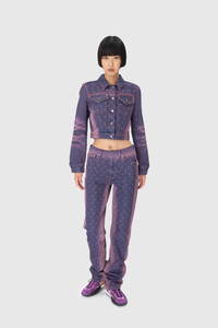 Fitted cropped jacket with a shirt collar The discount percentage displayed on Last Chance products is calculated based on the product's original selling price before markdowns. Product Detail - Buttoned front - Two flap pockets on chest - Two side pockets - Buttoned cuffs - Adjustable waist - Branded jacron woven under neck in back - Signature Moon laser printed all over on front, back and sleeve yokes - Overwashed airbrushed detail on side seams and middle sleeve whiskers - Logo engraved on buttons Composition and Traceability Product details page relating to environmental qualities or characteristics WJA041A CDEN0004 PU20 LAVENDER Composition: Base Material: 100% Cotton - Secondary Fabric: 100% Cotton Traceability: Weaving: Morocco Dyeing/Manufacturing: Italy