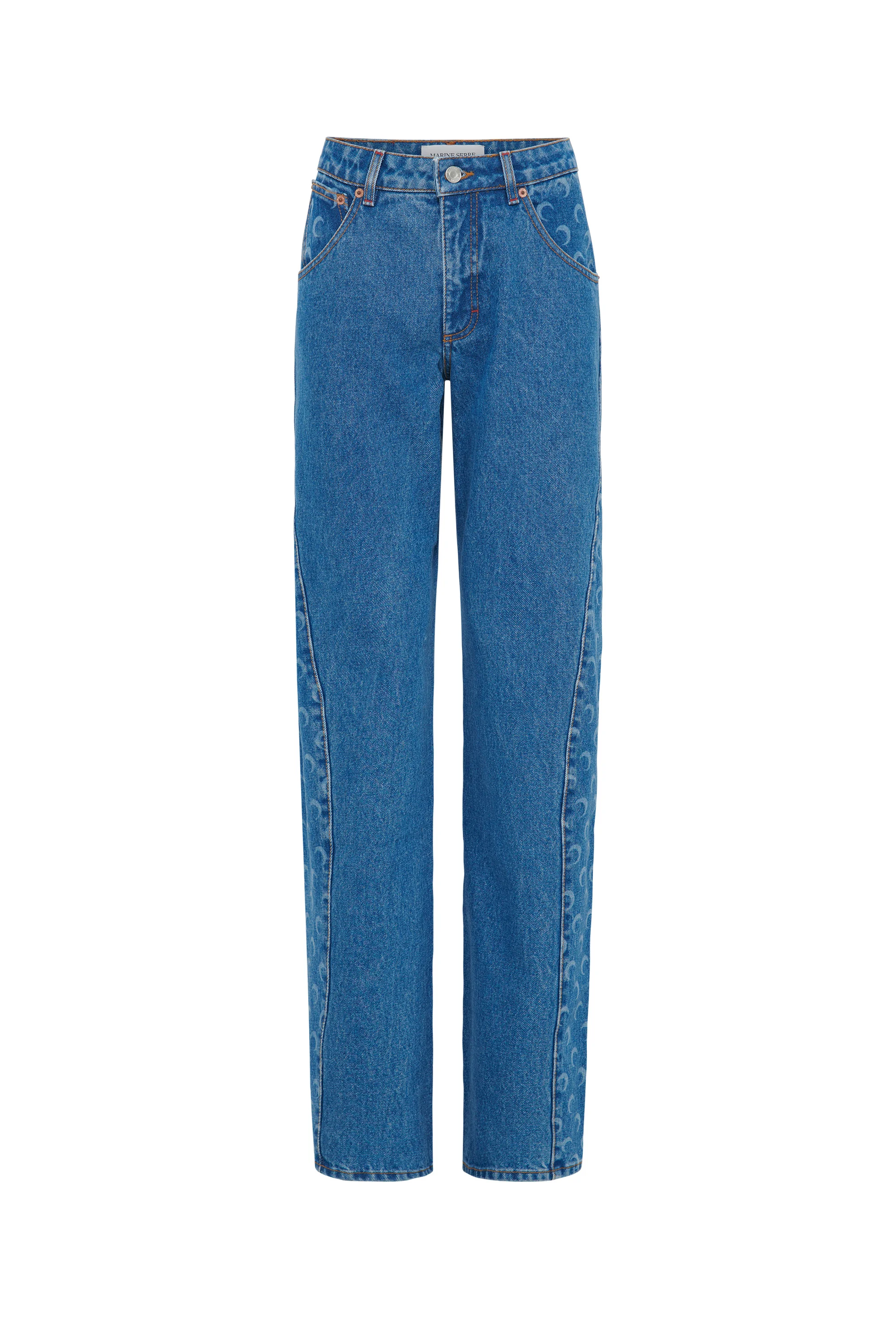 - Curved yoke on inside seam - Five pockets - Zipped closure with shank button - Moon allover laser printed denim on pockets and back panel - Belt loops - Embroidery on back pocket - Jacron with logo on back belt - Logo engraved on button Materials Moon Laser Denim Blue Marine Serre offers a 100% GOTS Certified Organic denim twill family of garments, in addition to a Regenerated one. For this new family of denims, Marine Serre has opted for a light washed classic indigo as well as a striking black variant. 100% Cotton