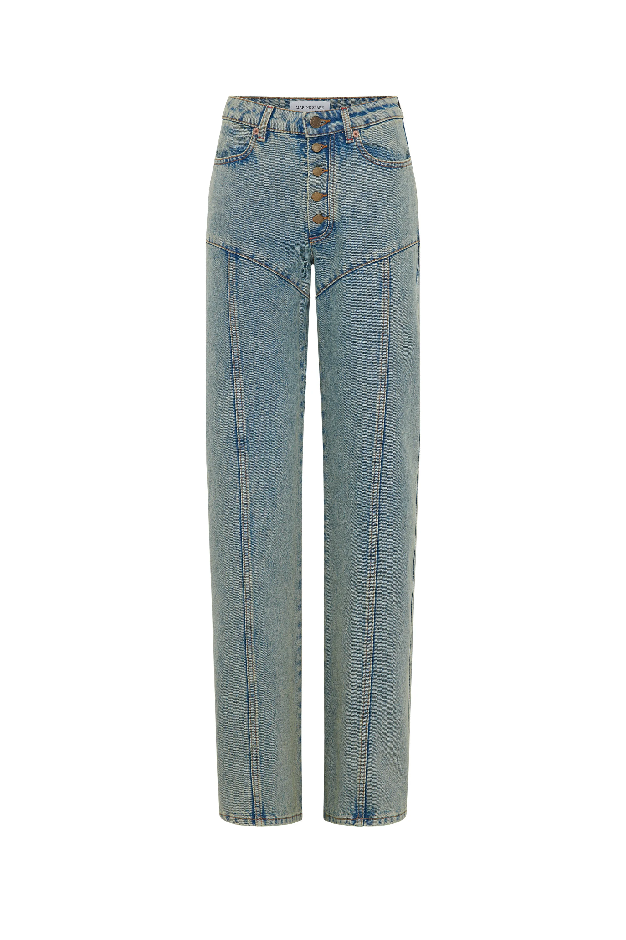 - Four pockets - Button closure with a shank button - Cut out on hips - Belt loops - Embroidery on back pocket - Branded jacron woven on back waistband - Signature Moon laser printed all over on waist, upper back yoke and pockets - Logo engraved on buttons - This item fits small. Choose one size up. Materials Moon Laser Denim The appeal of our All Over Moon denim never wanes, with this classic fabric returning again and again. Made from a GOTS-certified organic cotton canvas, our indigo denim is stonewashed to produce a light blue, sand and purple blue shades; the latter is also treated with a pigment spray to achieve a really vibrant gradient effect that fades to a paler purple at the sides of the garment. After stonewashing, the All Over Moon is laser-printed onto the pieces, its placement differing for each. All are finished with red reinforcement stitches, logo-engraved metal buttons, and a Marine Serre jacron back patch. 100% Coton (GOTS Certified)