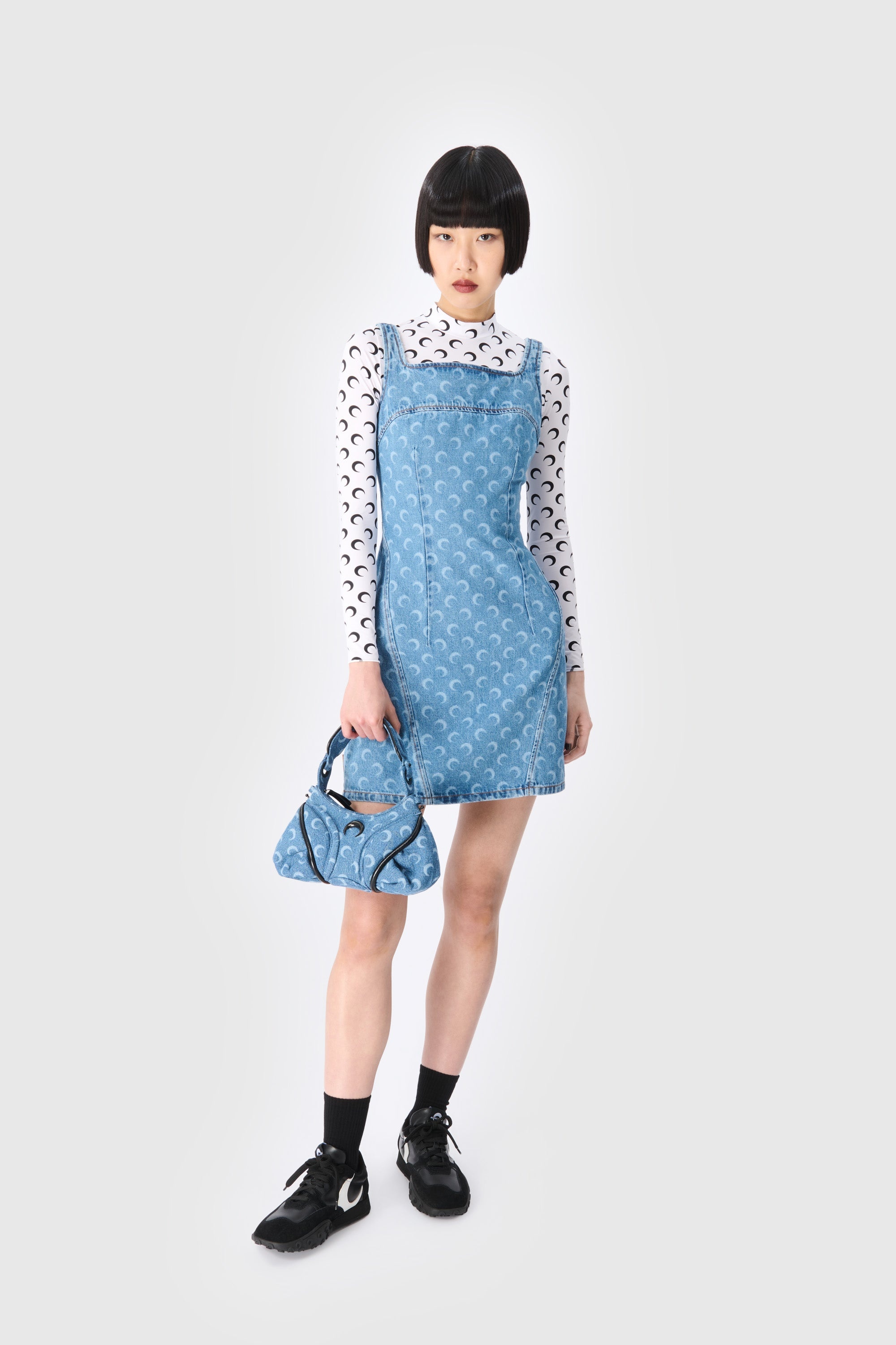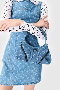 - Cut-out on side and back - Moon allover laser printed denim on front slits, waist, and back pocket - Zipper on center back - Jacron with logo on back hem - Logo engraved on zip puller - Logo engraved on button Materials Moon Laser Denim Blue Marine Serre offers a 100% GOTS Certified Organic denim twill family of garments, in addition to a Regenerated one. For this new family of denims, Marine Serre has opted for a light washed classic indigo as well as a striking black variant. 100% Cotton