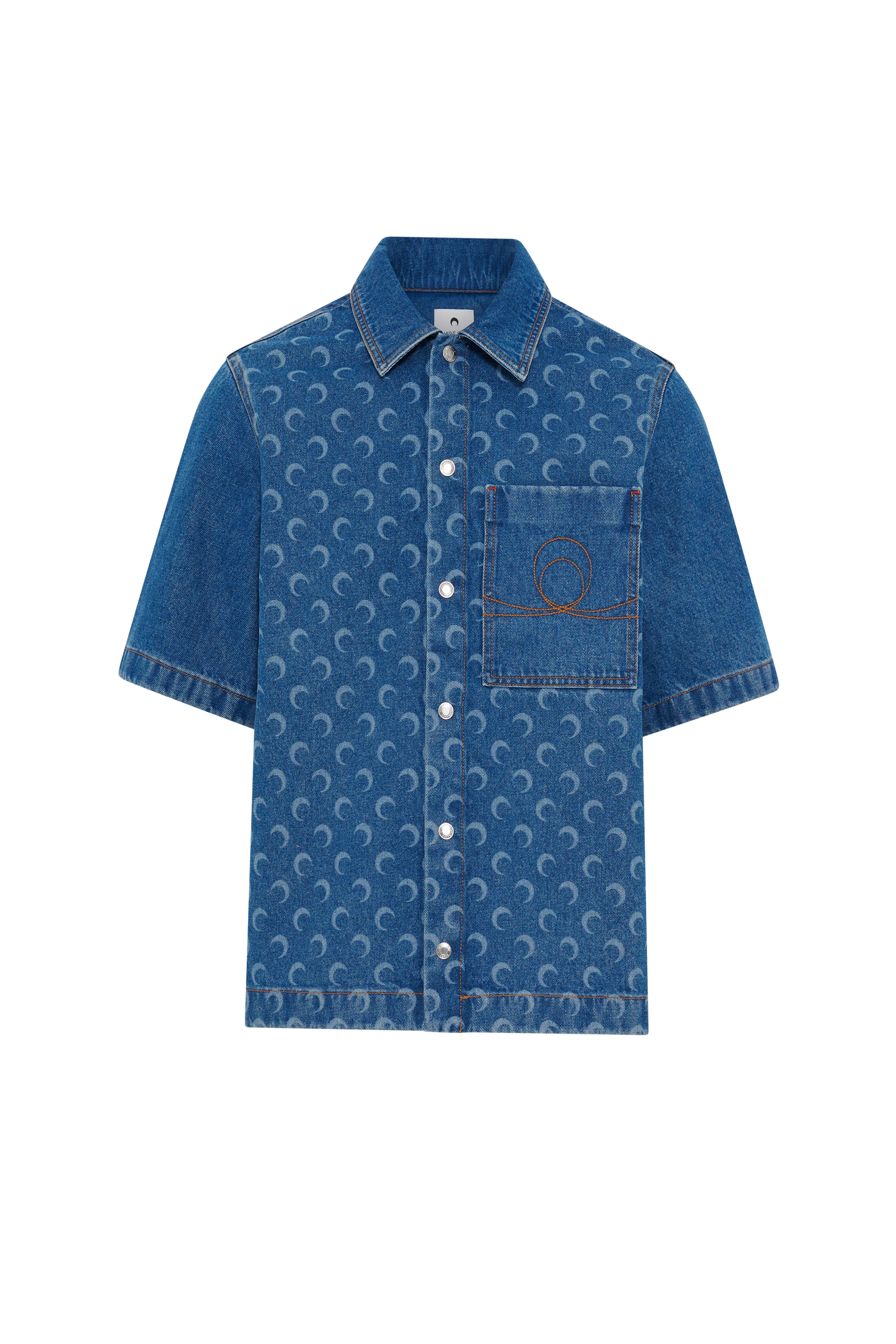 Boxy fit regular length shirt with shirt collar and short sleeves Product Detail - Buttoned front - One patch pocket with embroidery on the chest - Signature moon laser printed all over - Marine serre leather patch Composition and Traceability Product details page relating to environmental qualities or characteristics MSI017B CDEN0002 BL05 LIGHT BLUE Composition: Base Material: 100% Cotton Traceability: Weaving/Dyeing/Manufacturing: Turkey