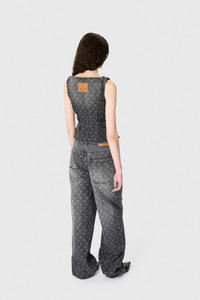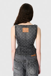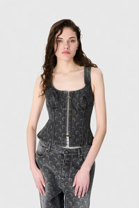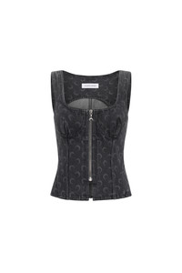 Fitted regular length bustier top with a squareneck and straps Product Detail - Princess seams contour the bustier - Zipper with signature moon puller - Corset-like structure enhances the silhouette - Signature moon laser printed all over - Marine serre leather patch Composition and Traceability Product details page relating to environmental qualities or characteristics WTO408B_CDEN0006_GR90_DARK_GREY Composition: Main fabric – 100% cotton Second fabric – 78% polyamide, 22% elastane Product care: Gentle hand wash Do not bleach Low temperature iron on reverse side Dry clean with precaution Do not tumble dry Traceability: Weaving/Dyeing/Manufacturing: Italy