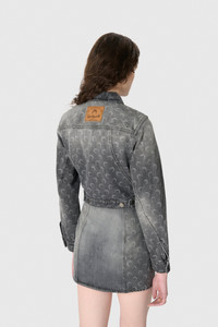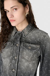Boxy fit short trucker jacket with shirt collar and long sleeves Product Detail - Buttoned front - Two flap pockets on chest - Two side pockets - Buttoned sleeve cuffs - Adjustable waist - Signature moon laser printed all over - Marine serre leather patch Composition and Traceability Product details page relating to environmental qualities or characteristics WJA041B_CDEN0006_GR90_DARK_GREY Composition: Base Material: 100% Cotton Product Care: Gentle hand wash Do not bleach Low temperature iron on reverse side Dry clean with precaution Do not tumble dry Traceability: Weaving/Dyeing/Manufacturing: Italy