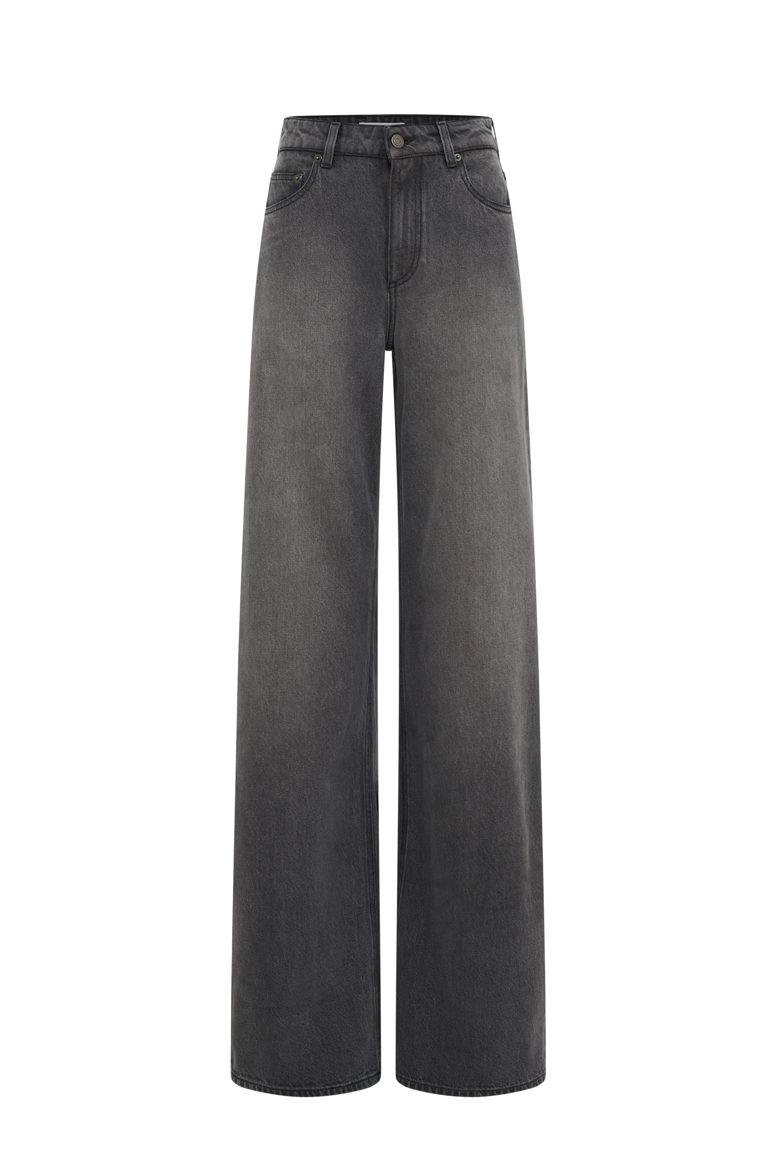 High-waisted regular length flare denim pants Product Detail - Zipper and button - Five pockets - Belt loops - Signature moon laser printed all over on the back - Cotton twill on front pockets - Marine serre leather patch Composition and Traceability Product details page relating to environmental qualities or characteristics WPA159A_CDEN0006_GR90_DARK_GREY Composition: Base Material: 100% Cotton Product Care: Machine wash 30°C with precaution and without spinning Do not bleach Low temperature iron on reverse side Dry clean with precaution Do not tumble dry Traceability: Weaving/Dyeing/Manufacturing: Italy