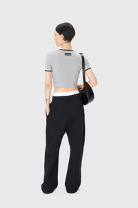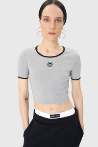 - Ribbed neckline and cuffs - Contrasted finishings - Moon logo embroidered under neck in front - Branded label woven under neck in back Materials Moon Logo Jersey All the cotton Marine Serre sources for Borderline is GOTS-certified — this world-leading textile processing standard chiming with the house’s own well-known commitment to protecting the planet. In terms of the silhouettes across these ranges, we wanted to offer a wide range of everyday styles that are directly inspired by the world of sportswear. Our Moon Logo Jersey lines come in a range of traditional colours (white, black and grey, but in most cases lilac too) spun out across t-shirts, tanks and dresses, as well as underwear. These garments are finished in the classic way familiar from sportwear garments, with our Moon Logo in raised embroidery just below the neckline. Some of the Recycled Cotton Jerseys (lilac and grey) feature our MS Sport logo — a print moon with Marine Serre embroidered above, and we have also expanded our palette with seasonal colours such as red and blue, bearing a Gradient All Over Moon print. 100% Organic Cotton (GOTS certified)