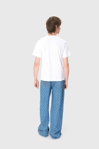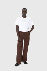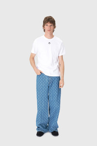 - Ribbed crewneck collar - Cover stitched hem - Contrasted black circle Moon logo embroidery placed below the front collar in center - MARINE SERRE Borderline label on the upper back Materials White Organic Cotton All of the cotton that Marine Serre sources for the BORDERLINE collection is certified GOTS (Global Organic Textile Standard). This certification is the worldwide leading textile processing standard for organic fibers and provides credible assurance of responsible manufacturing with the least chemical inputs. In terms of shapes, the House proposes a wide range of everyday styles taken directly from the sportswear universe. 100% Cotton (GOTS Certified)