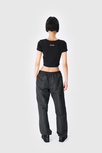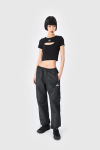 - Ribbed neckline - Baby fit construction - Layered cutout in front - Embroidered logo under neck in front - Woven label with logo under neck in back Materials Black Organic Cotton All of the cotton that Marine Serre sources for the BORDERLINE collection is certified GOTS (Global Organic Textile Standard). This certification is the worldwide leading textile processing standard for organic fibers and provides credible assurance of responsible manufacturing with the least chemical inputs. In terms of shapes, the House proposes a wide range of everyday styles taken directly from the sportswear universe. 95% Organic Cotton, 5% Elastane