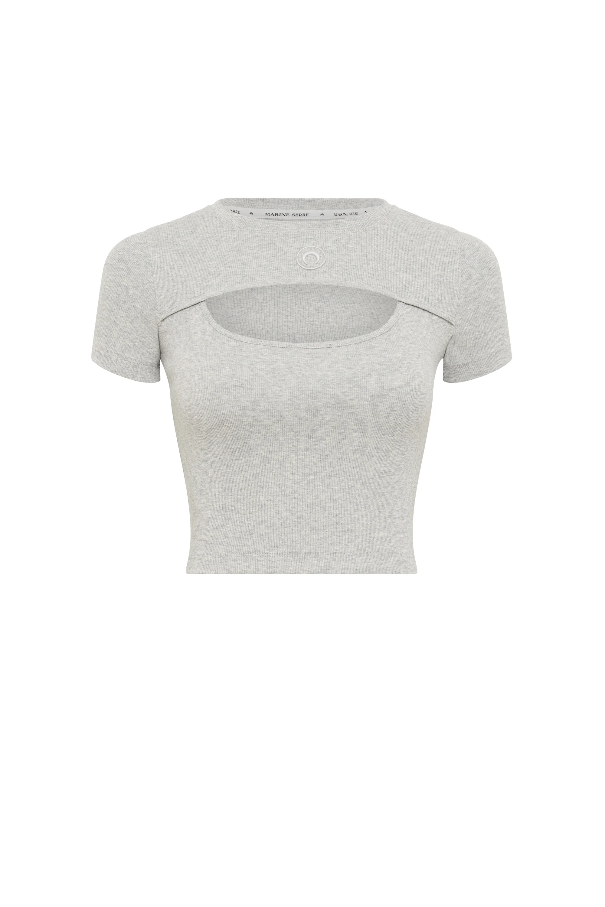 - Ribbed neckline - Baby fit construction - Layered cutout in front - Embroidered logo under neck in front - Woven label with logo under neck in back Materials Grey Organic cotton All of the cotton that Marine Serre sources for the BORDERLINE collection is certified GOTS (Global Organic Textile Standard). This certification is the worldwide leading textile processing standard for organic fibers and provides credible assurance of responsible manufacturing with the least chemical inputs. In terms of shapes, the House proposes a wide range of everyday styles taken directly from the sportswear universe. 100% Cotton