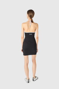 Halter neck short dress Product Detail - Contrasted ribbed neck - Tying knot behind the neck - Embroidered moon logo Composition and Traceability Product details page relating to environmental qualities or characteristics WDR082A_CJER0008_BK96_BLACK/WHITE Composition: 100% Cotton Traceability: Weaving, Dyeing, Manufacturing: Turkey