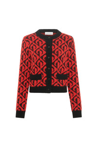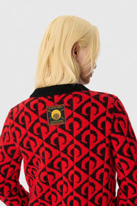 Classic fitted short length cardigan with a crewneck and long sleeves Product Detail - Ribbed neckline - Front closure with 6 engraved buttons - Two small horizontal pockets on the front - Ribbed sleeves and bottom finishings - Jacquard stitch with lozenge moon signature artwork - Marine Serre knit patch Composition and Traceability Product details page relating to environmental qualities or characteristics WTK086A_CKNI0539_BK97_BLACK/RED Composition: 60% Virgin Wool, 25% Mohair, 15% Polymide Traceability: -Weaving/Dyeing/Manufacturing: Italy