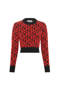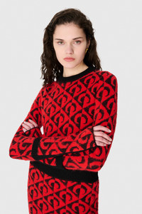 Fitted short length sweater with crewneck and long sleeves Product Detail - Ribbed neckline - Ribbed sleeves and bottom finishings - Jacquard stitch with lozenge moon signature artwork - Marine Serre knit patch Composition and Traceability Product details page relating to environmental qualities or characteristics WTK044A_CKNI0539_BK97_BLACK/RED Composition: 60% Virgin Wool, 25% Mohair, 15% Polyamide Product Care: Gentle hand wash Do not bleach Do not iron Dry clean with precaution Do not tumble dry Traceability: -Weaving/Dyeing/Manufacturing: Italy