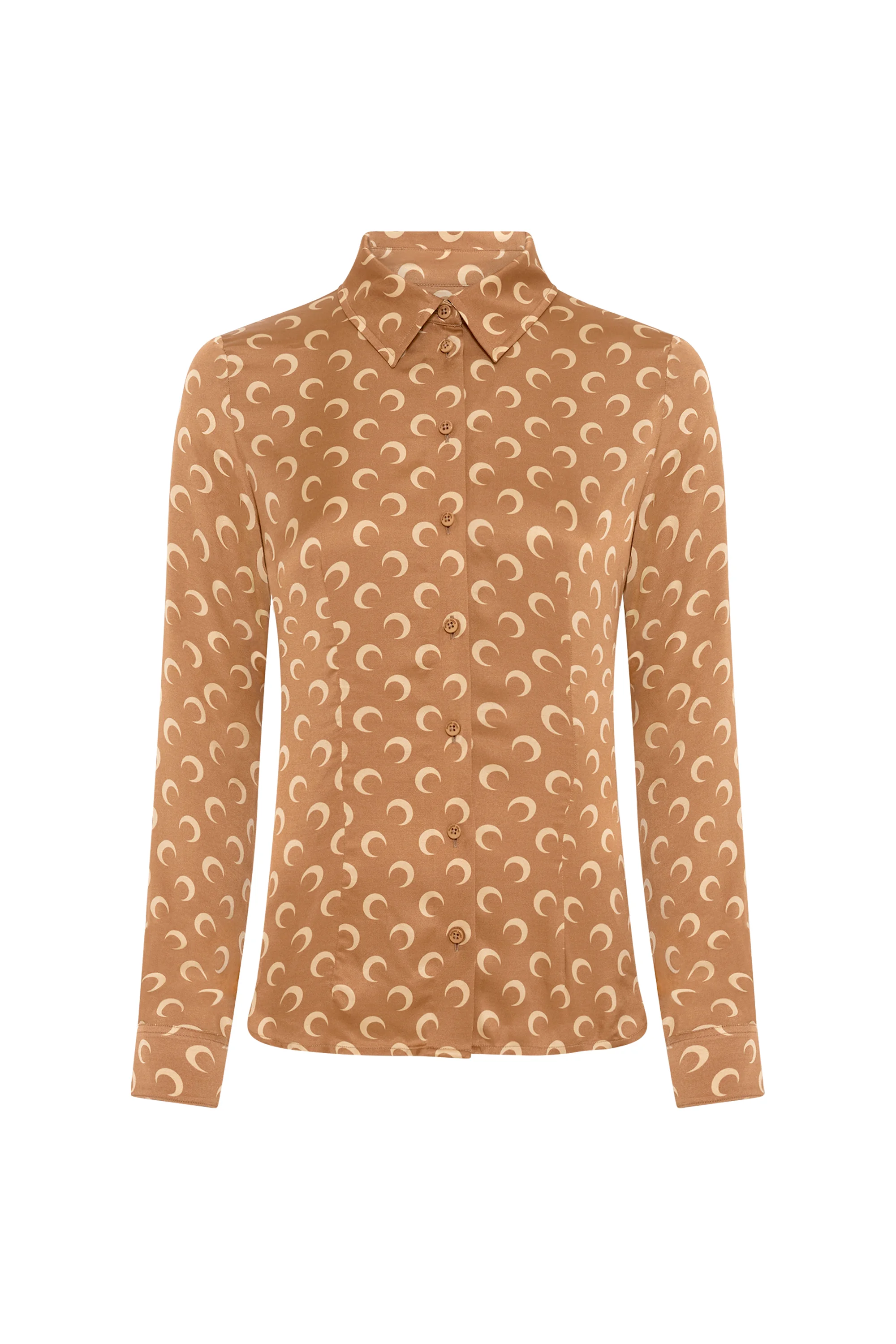 - Straight grain cut - Tailored sleeves with plackets and two button cuffs - Seven button front - Darted front - Rolled hem - Logo engraved buttons Materials Moon Printed Flou Dark Camel 100% Viscose