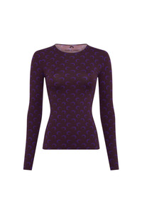 - Reinforced neckline - Cuffs and hem finished with raw edges - All over moon printed Materials Jersey All Over Moon Aubergine The All Over Moon print is the banner of the House, it represents the house’s virtues and vision of Futurewear, ever present since the very beginning of the House for RADICAL CALL FOR LOVE. Indeed, what is perhaps the House’s most popular line holds its values at heart with a jersey composed entirely of recycled material. 88% Polyamide (GRS Certified) - Recycled, 12% Elastane