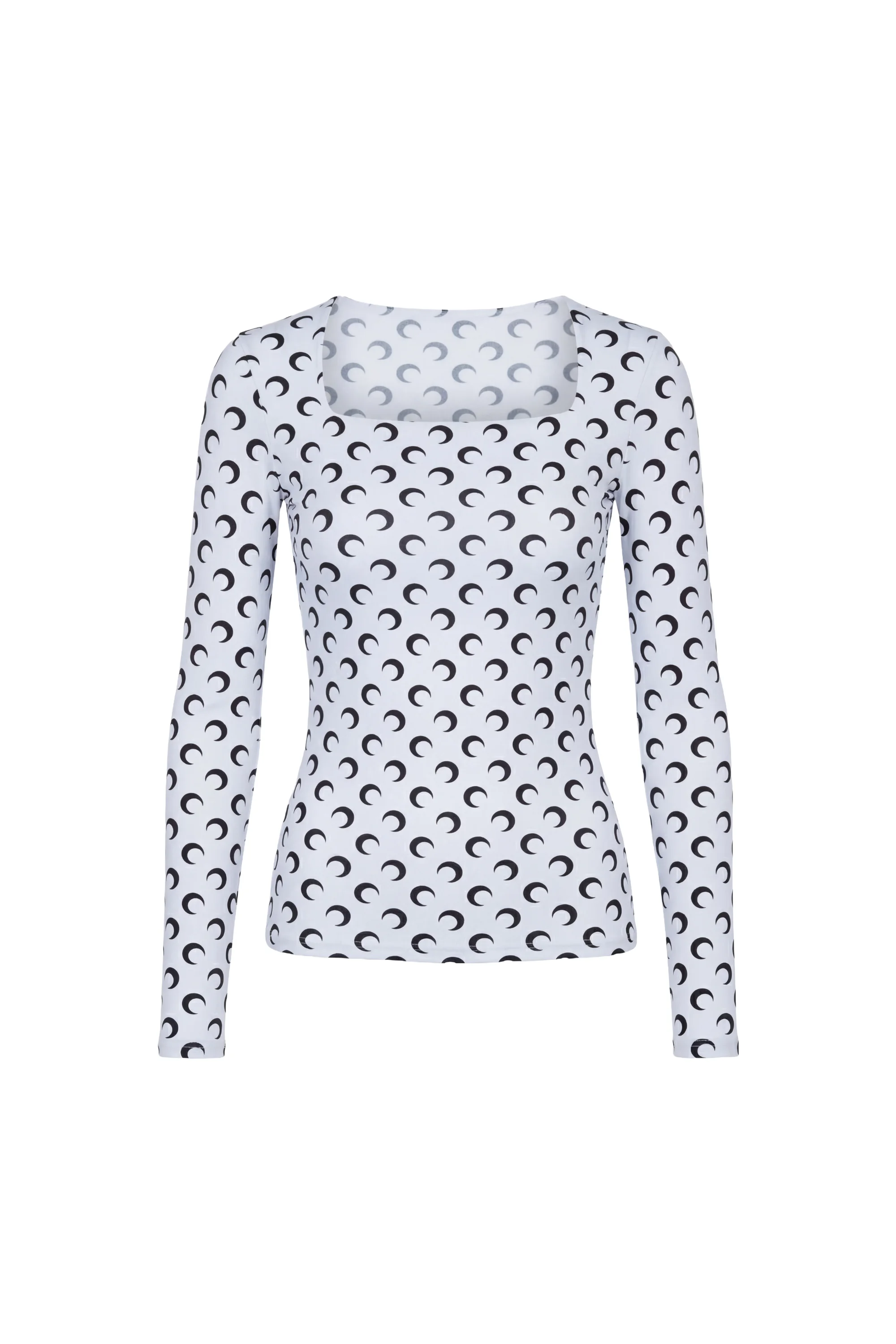 Regular length second skin top with square neck and long sleeves Product Detail - Reinforced neckline - Facing panel at the chest - All over moon printed Composition and Traceability Product details page relating to environmental qualities or characteristics WTS017A_CJER0001_WH00_OPTICAL_WHITE Composition: 88% Polyamide, 12% Elastane Recycled material: 88% (Polyamide) Releases plastic microfibers into the environment when washing Traceability: Weaving, Dyeing: Italy Manufacturing: Portugal