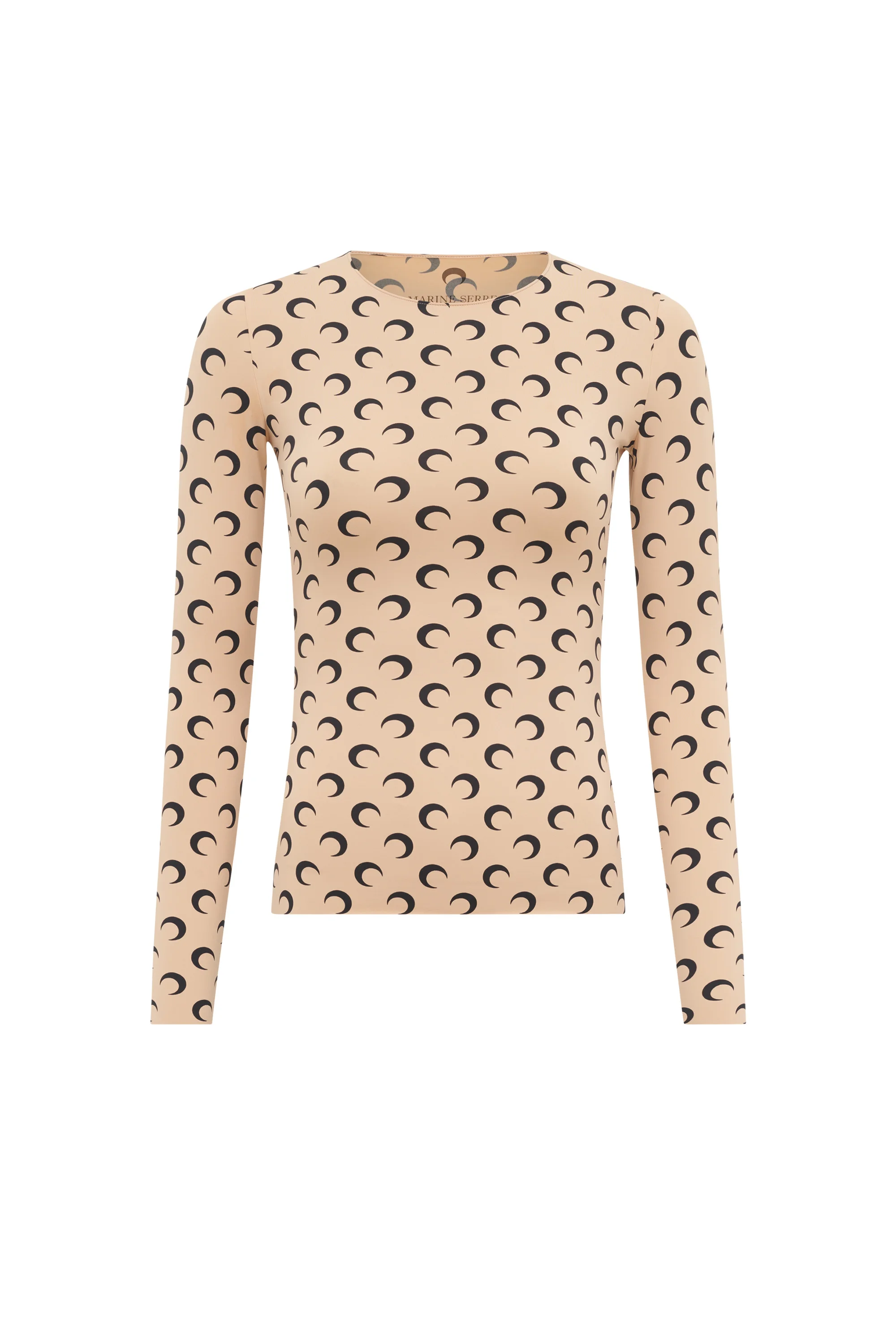 - Reinforced neckline - Moon print allover - Cuffs and hem finished with raw edges Materials All Over Moon Jersey Tan The All Over Moon print is the banner of the House, it represents the house’s virtues and vision of Futurewear, ever present since the very beginning of the House for RADICAL CALL FOR LOVE. Indeed, what is perhaps the House’s most popular line holds its values at heart with a jersey composed entirely of recycled material. 88% Polyamide (GRS Certified) - Recycled, 12% Elastane