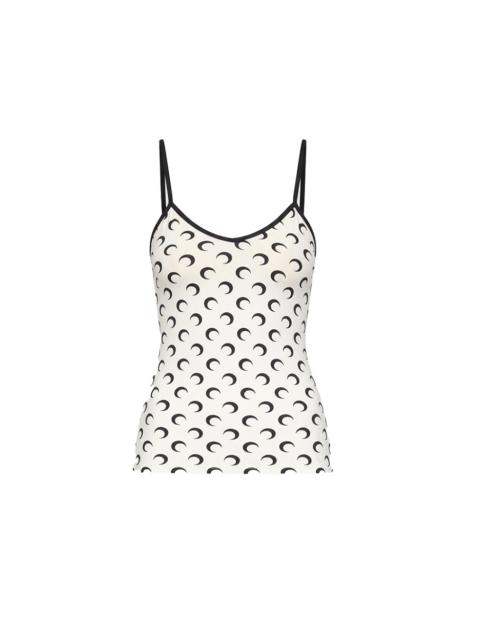Fitted strap top with spaghetti shoulder straps Product Detail - Neck finished with bias - All over moon printed Composition and Traceability Product details page relating to environmental qualities or characteristics WTO508A_CJER0001_IT99_INVERSE_TAN Composition : 86% Polyamide, 14% Elastane Traceability: Weaving/Dyeing: Italy Manufacturing: Portugal