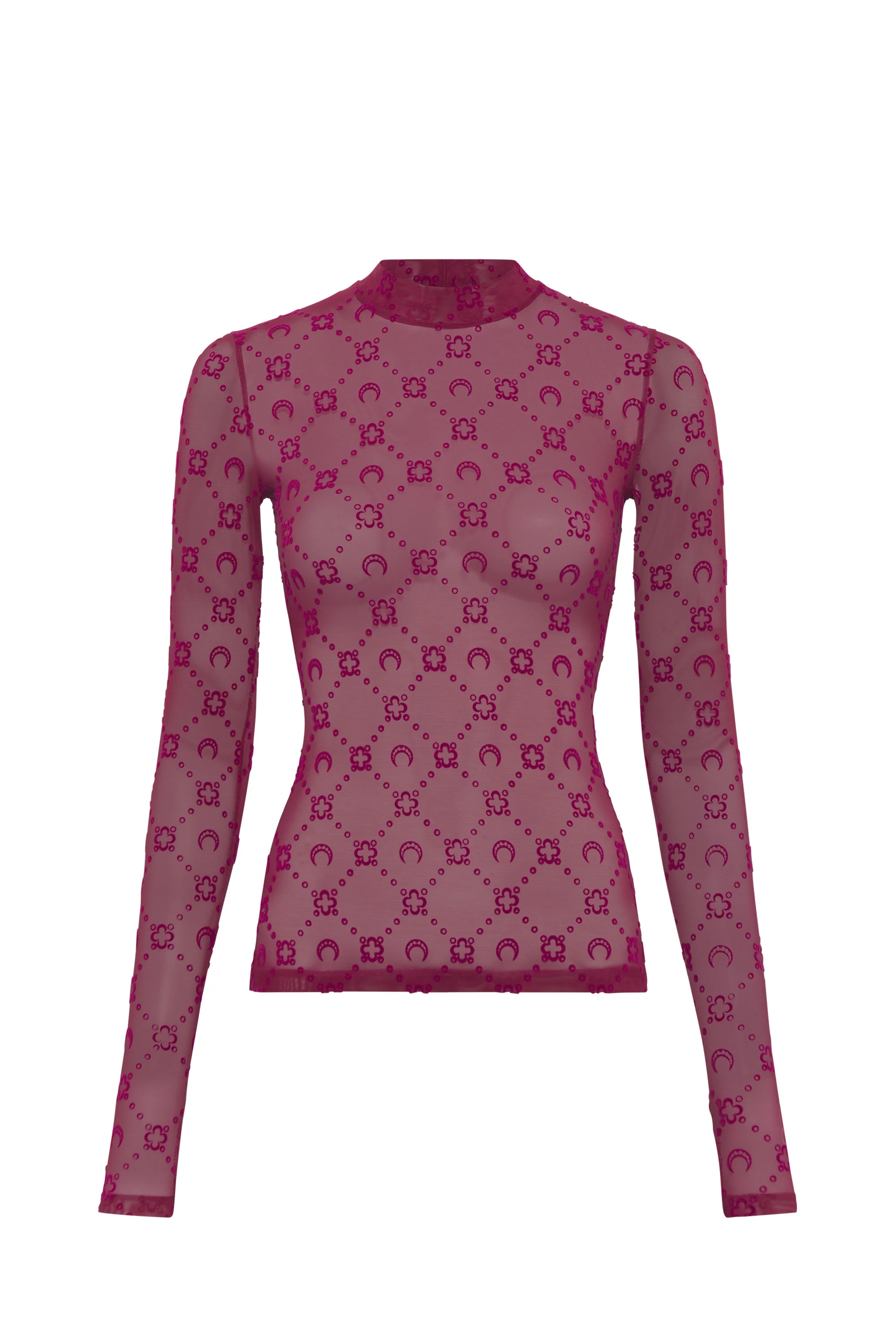 - Extra long sleeves with thumb holes - Moonogram flock allover - Label with logo on side seam Materials Moonogram Mesh Flock Cherry The Moonogram motif is flocked with soft velvet on our recycled mesh jersey, creating an incredibly comfortable fabric. The mesh’s transparency calls back to Marine Serre’s transgressive vision by having a material traditionally used solely for lingerie reimagined as day-to-day wear 86% Polyamides, 14% Elasthane