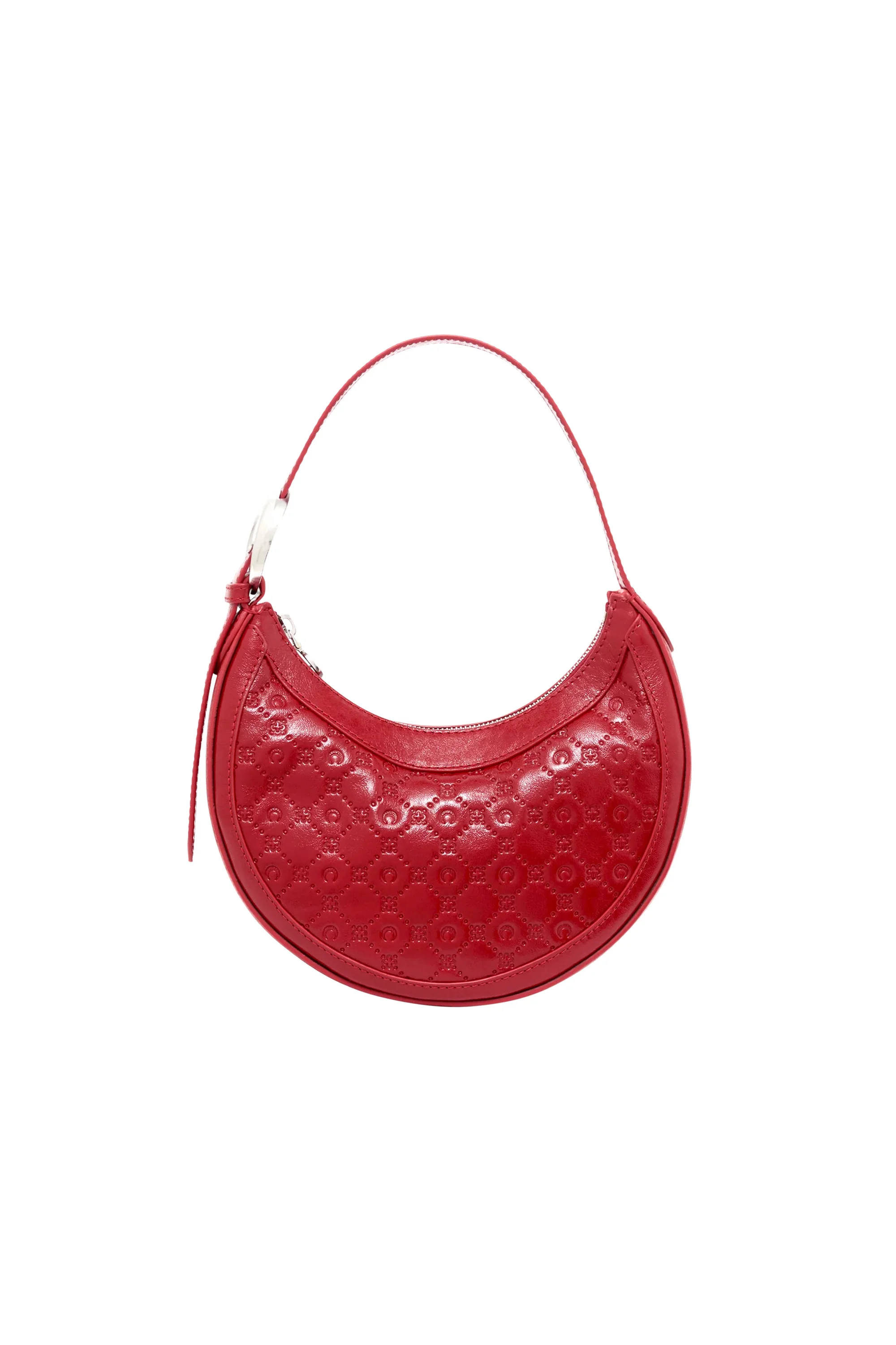 - Zipper closure with Moon engraved puller - Leather handle with Signature Moon buckle - Interior in Moon jacquard lining, featuring an inside pocket, and a foiled logo patch. - 23 x 18 x 7 cm - Adjustable handle : 14 to 25 cm drop length Materials Moonogram Embossed Leather Red 100% Calf Skin (LWG GOLD)