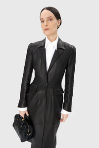 - Signature Moonogram embossed leather collar and inner sleeves - Single button front closure - Metallic signature Moon button - Two welted flap pockets in front - Signature Moon jacquard lining - Branded leather patch under neck in back Materials Moonogram Embossed Leather A staple of Marine Serre Couture, this premium sheepskin leather is made in Italy and has a satin sheen that naturally gives off light, as though it has already acquired a delicate patina over time. The grained, structured leather is then heat-embossed to reveal the house’s Moonogram print. The pieces in this range draw inspiration from classic tailoring codes, which merge seamlessly with Marine Serre’s resolutely contemporary vision: women’s styles, from fitted coats and jackets, to a glamorous bustier dress, are fitted to follow the curves of the body. The men’s pieces are modern and luxurious wardrobe staples. 100% Lambskin