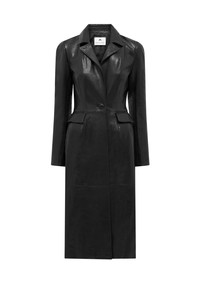 Fitted midi length coat with a notch lapel collar and padded shoulders Product Detail - Signature Moonogram embossed leather collar and inner sleeves - Single button front closure - Metallic signature Moon button - Two welted flap pockets in front - Signature Moon jacquard lining - Branded leather patch under neck in back Composition and Traceability Product details page relating to environmental qualities or characteristics WCO023A_RLEA0021_BK99_BLACK Composition: Base Material: 100% Sheep Skin - Lining: 100% Viscose LWG certified tannery Product Care: Professional leather cleaning only Traceability: Weaving, Dyeing, Manufacturing: Italy