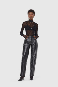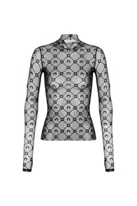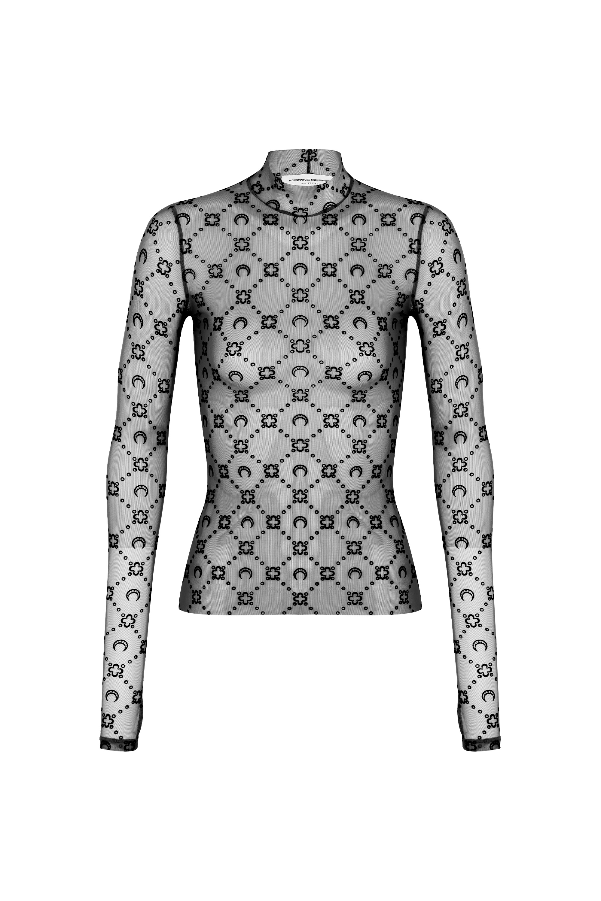 Turtleneck neckline with self-fabric bias MARINE SERRE brand label on left cuff Cover stitched hem and cuffs Materials Moonogram Mesh Flock Black The Moonogram was first introduced in CORE where it was used as an elegant variant of our iconic Moon print on loungewear pieces. It has since been a staple in every collection, where it was proposed in different materials such as leather before finally finding its footing in our mesh category. Here, the Monogram motif is flocked with soft velvet all over on our recycled mesh jersey, creating an incredibly comfortable fabric. The garments’ comfort in this category is further accentuated by our mesh allowing perfect ease of movement and breathability. The mesh’s transparency calls back to Marine Serre’s transgressive vision by having a material traditionally used solely for lingerie reimagined as day-to-day wear. The shapes in this material follow the house’s iconic form fitting second skin fit. 86% Polyamide Recycled, 14% Elastane