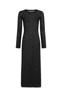 Round neckline with self-fabric bias Dress slit on left hand side MARINE SERRE branded label at the top of slit Babylock hem and cuffs Materials Mesh Flock Glitter 86% POLYAMIDE , 14% ELASTANE