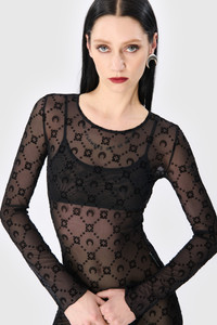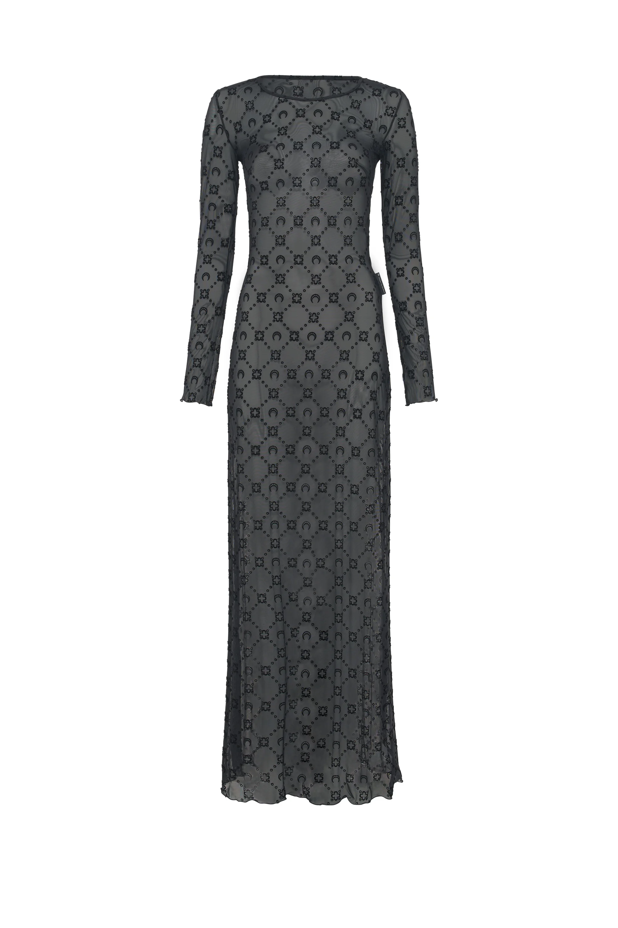 - Open neck - Reinforced neckline - Darted chest - Moonogram flock allover - Maxi length - Babylock cuffs and hem - Label with logo on side seam Materials Moonogram Mesh Flock Black The Moonogram motif is flocked with soft velvet on our recycled mesh jersey, creating an incredibly comfortable fabric. The mesh’s transparency calls back to Marine Serre’s transgressive vision by having a material traditionally used solely for lingerie reimagined as day-to-day wear 86% Polyamide Recycled, 14% Elastane