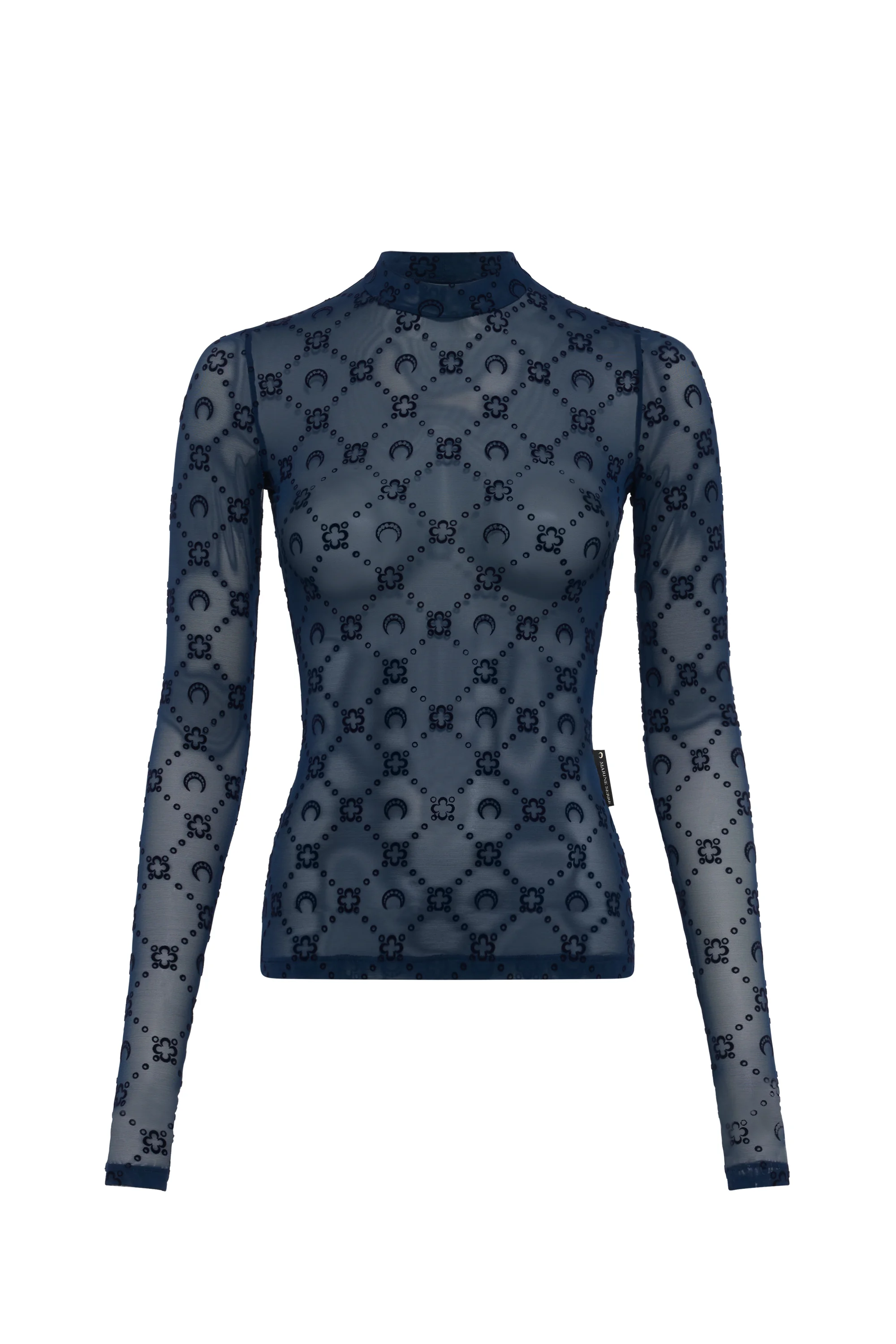 - Extra long sleeves with thumb holes - Moonogram flock allover - Label with logo on side seam Materials Moonogram Mesh Flock Navy The Moonogram motif is flocked with soft velvet on our recycled mesh jersey, creating an incredibly comfortable fabric. The mesh’s transparency calls back to Marine Serre’s transgressive vision by having a material traditionally used solely for lingerie reimagined as day-to-day wear 86% Polyamides, 14% Elasthane
