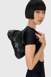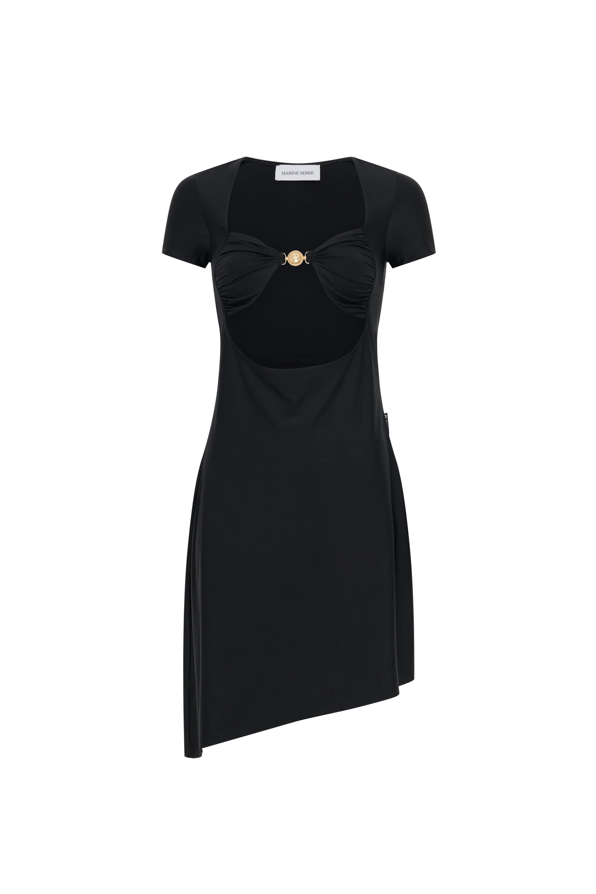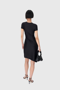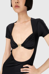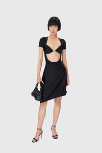 - Self fabric bralette with Moon jewelry clip closure - Turned hem Materials Draped Jersey In many ways, elevating conventional fabrics such as activewear jersey through precise couture techniques has served as the blueprint for Marine Serre’s transgressive vision of womenswear at large. This unabashedly glamorous, all-female range reimagines traditional sportswear styles through draping, pleating and a trompe l’oeil play on transparency. Garments emphasize the bust and hips, with a prominent use of cut-outs, complimented by our seductive Moonogram Mesh Jersey (made from GRS-certified recycled fibres). All are designed with full ease of movement in mind — even traditional evening silhouettes. To this end the draped jersey is smooth and soft, with a natural sheen. 65% Polyamide, 35% Elastane