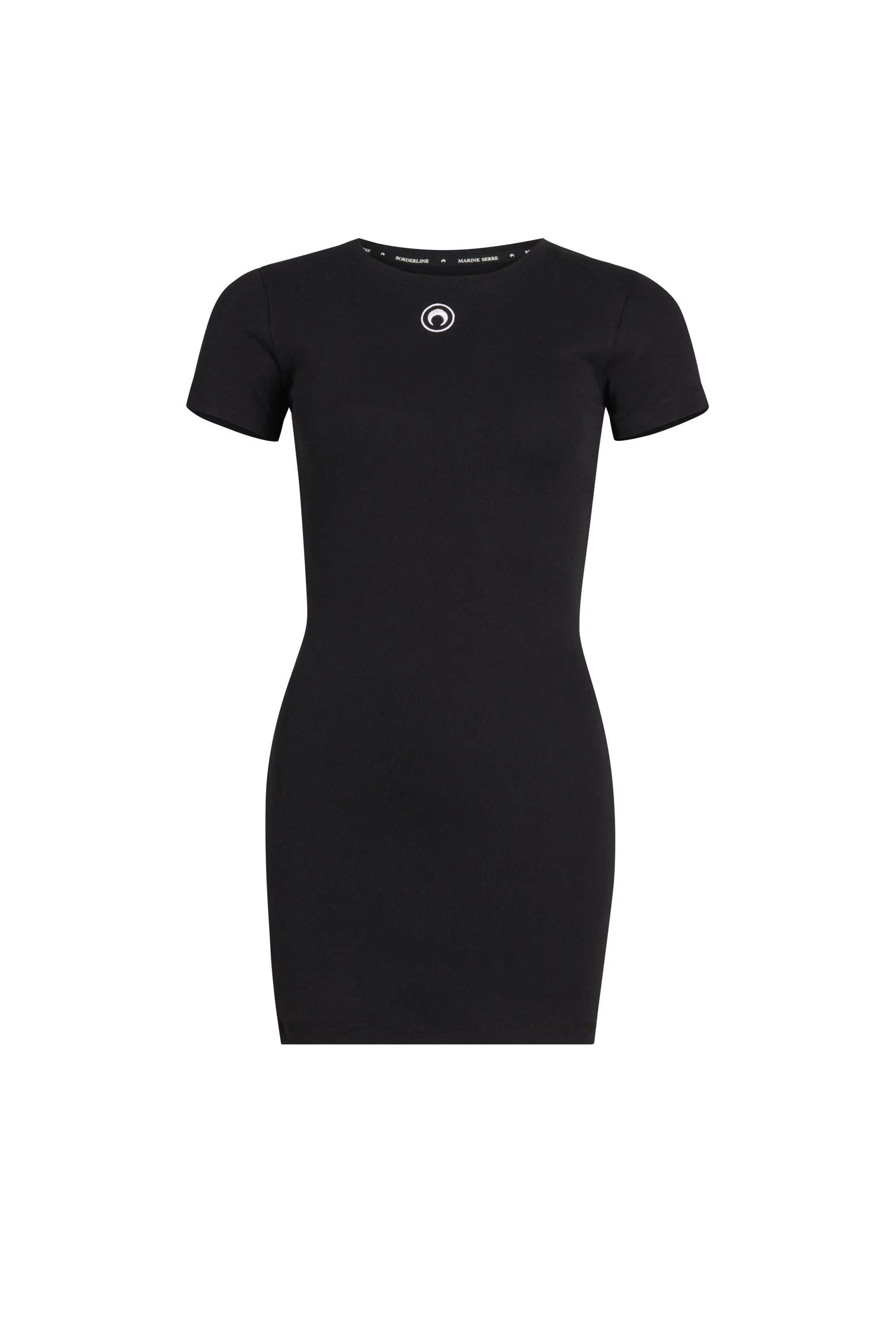 - Crewneck with ribbed collar - Circle Moon logo white embroidery below collar in center - Black MARINE SERRE branded label stitched on upper back below collar - Cover stitching along hem and cuffs with self-fabric bias finish Materials Black Organic Cotton All of the cotton that Marine Serre sources for the BORDERLINE collection is certified GOTS (Global Organic Textile Standard). This certification is the worldwide leading textile processing standard for organic fibers and provides credible assurance of responsible manufacturing with the least chemical inputs. In terms of shapes, the House proposes a wide range of everyday styles taken directly from the sportswear universe. 95% Organic Cotton, 5% Elastane