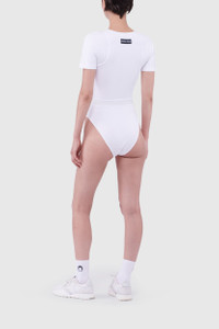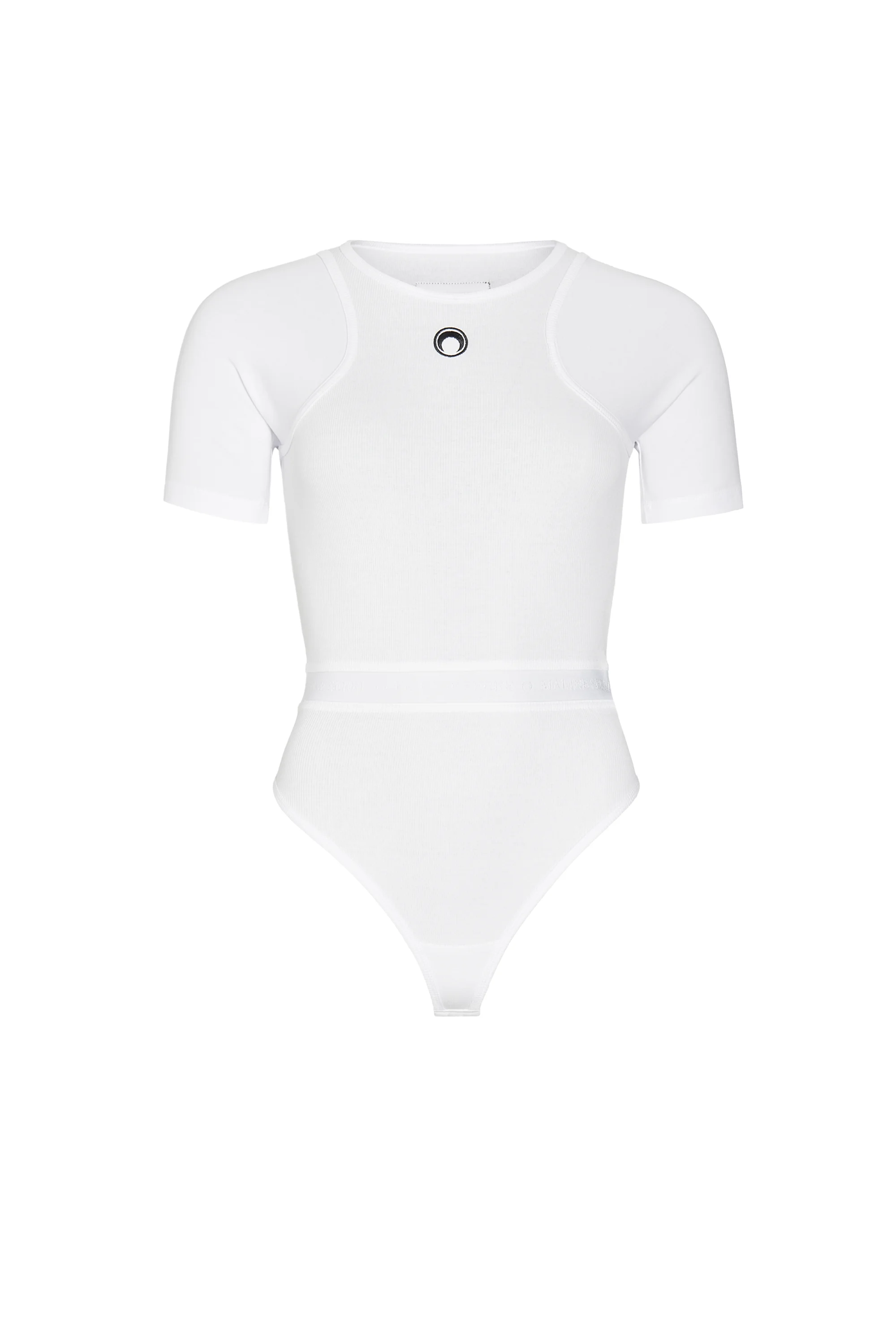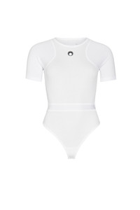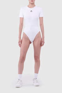 Crafted from stretch organic cotton, this bodysuit boasts a flattering slim fit. It features a round neck, short sleeves and an elasticated waistband. The moon embroidery in the front and the rear logo patch reinforce the branded look. Materials White Organic Cotton Marine Serre’s Borderline groups all the essential layering pieces synonymous with the brand. Through a body-conscious approach, these accessible pieces sheathe the body in the shape of second skins or casual t-shirt archetypes. 100% Organic Cotton