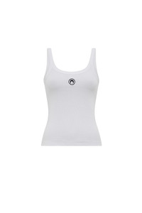 Jersey rib bias Cover stitched along collar strap and armholes Contrasted black circle Moon logo embroidery placed below the collar in the middle Black MARINE SERRE branded label stitched on upper back below collar Cover stitching along hem with self-fabric bias finish Materials White Organic Cotton Marine Serre’s Borderline groups all the essential layering pieces synonymous with the brand. Through a body-conscious approach, these accessible pieces sheathe the body in the shape of second skins or casual t-shirt archetypes. 100% Organic Cotton