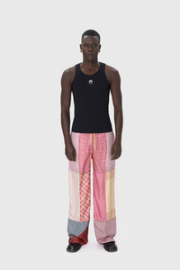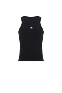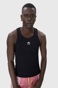 - Jersey rib bias - Cover stitched along collar and armholes - White circle Moon logo embroidery placed below the collar in center - Black MARINE SERRE branded label stitched on upper back below collar - Cover stitching along hem with self-fabric bias finish Materials Black Organic Cotton All of the cotton that Marine Serre sources for the BORDERLINE collection is certified GOTS (Global Organic Textile Standard). This certification is the worldwide leading textile processing standard for organic fibers and provides credible assurance of responsible manufacturing with the least chemical inputs. In terms of shapes, the House proposes a wide range of everyday styles taken directly from the sportswear universe. 95% Organic Cotton, 5% Elastane
