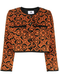 Oriental Towels cropped jacket Marine Serre's sustainable approach to fashion is manifested in this cropped jacket, made from repurposed jacquard towels in a striking black and orange floral pattern. Made in Italy Composition Body: Cotton 100% SIZE & FIT Model measurements Height 5 ft 9 in(1.76 m) Bust/Chest 31.1 in(79 cm) Hips 35.03 in(89 cm) Waist 24.4 in(62 cm) FittingInformation This piece fits true to size. We recommend you get your regular size Cut for a loose fit Made with a mid-weight fabric Washing instructions Hand Wash