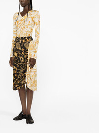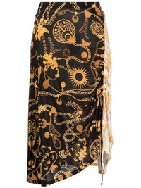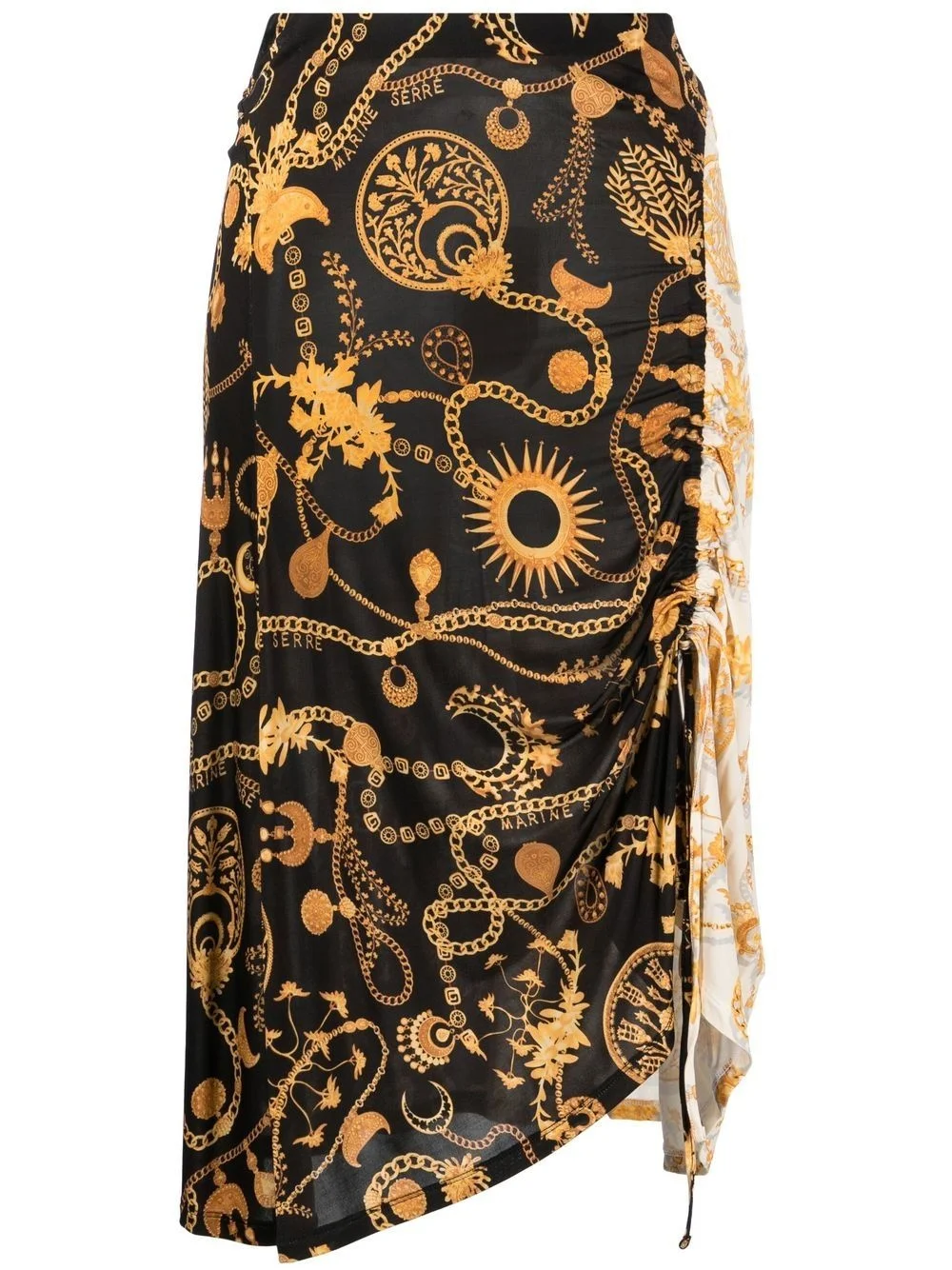 Ornament Moon-print midi skirt Unapologetic prints, abstract designs and fluid silhouettes continue to underpin Marine Serre's dynamic design vision, as evidenced by this vibrant midi skirt. Crafted from the brand's signature crepe jersey, it's elevated by an all-over chain pattern. Imported Composition Viscose 93%, Elastane 7% SIZE & FIT Model measurements Height 5 ft 10 in(1.79 m) Bust/Chest 31.1 in(79 cm) Hips 35.03 in(89 cm) Waist 24.01 in(61 cm) FittingInformation This piece fits true to size. We recommend you get your regular size Designed to be fitted at the waist and hips, loose over the leg Made with a mid-weight fabric