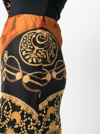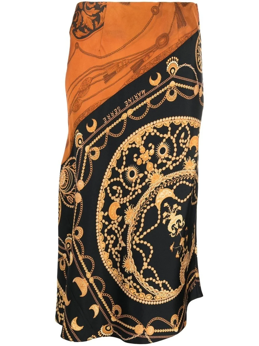 regenerated jewellery-print silk skirt Marine Serre displays her fondness for ornamental graphics in this skirt. Crafted from silk, this piece boasts a jewellery-printed, panelled design. Highlights - Burnt orange - Silk - All-over graphic print Made in France Composition Lining: Silk 100% Outer: Silk 100% SIZE & FIT Model measurements Height 5 ft 10 in(1.78 m) Bust/Chest 33.07 in(84 cm) Hips 35.82 in(91 cm) Waist 25.98 in(66 cm) FittingInformation This piece fits true to size. We recommend you get your regular size Designed to be fitted at the waist and hips, loose over the leg Made with a lightweight fabric Washing instructions Dry Clean Only