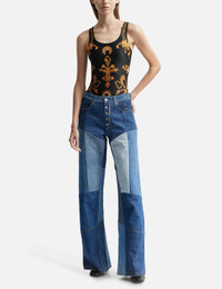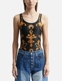 - Marine Serre - Ornament Jewelry Sporty Swimsuit - All-over ornament jewelry print - Scoop neckline - Sleeveless design - Cut-out detailing to the rear - Logo lettering to the rear - Color: Ornament Jewelry Black Gold - Material: 78% Recycled Polyamides, 22% Elastane - See more Swimwear and Clothing SIZING Approximate measurement: - Model wears size S - Model measures: Height 180cm, Chest 32.6”/83cm, Waist 23.2”/59cm,Hip 35”89cm - Torso (Start at one shoulder, run tape through leg and back up to the starting point.) - XS: 134cm, S: 136cm, M: 138cm, L: 140cm - Chest Circumference - XS: 68cm, S: 72cm, M: 74cm, L: 78cm - Waist Circumference - XS: 54cm, S: 56cm, M: 60cm, L: 64cm - Hips Circumference - XS: 60cm, S: 64cm, M: 66cm, L: 70cm