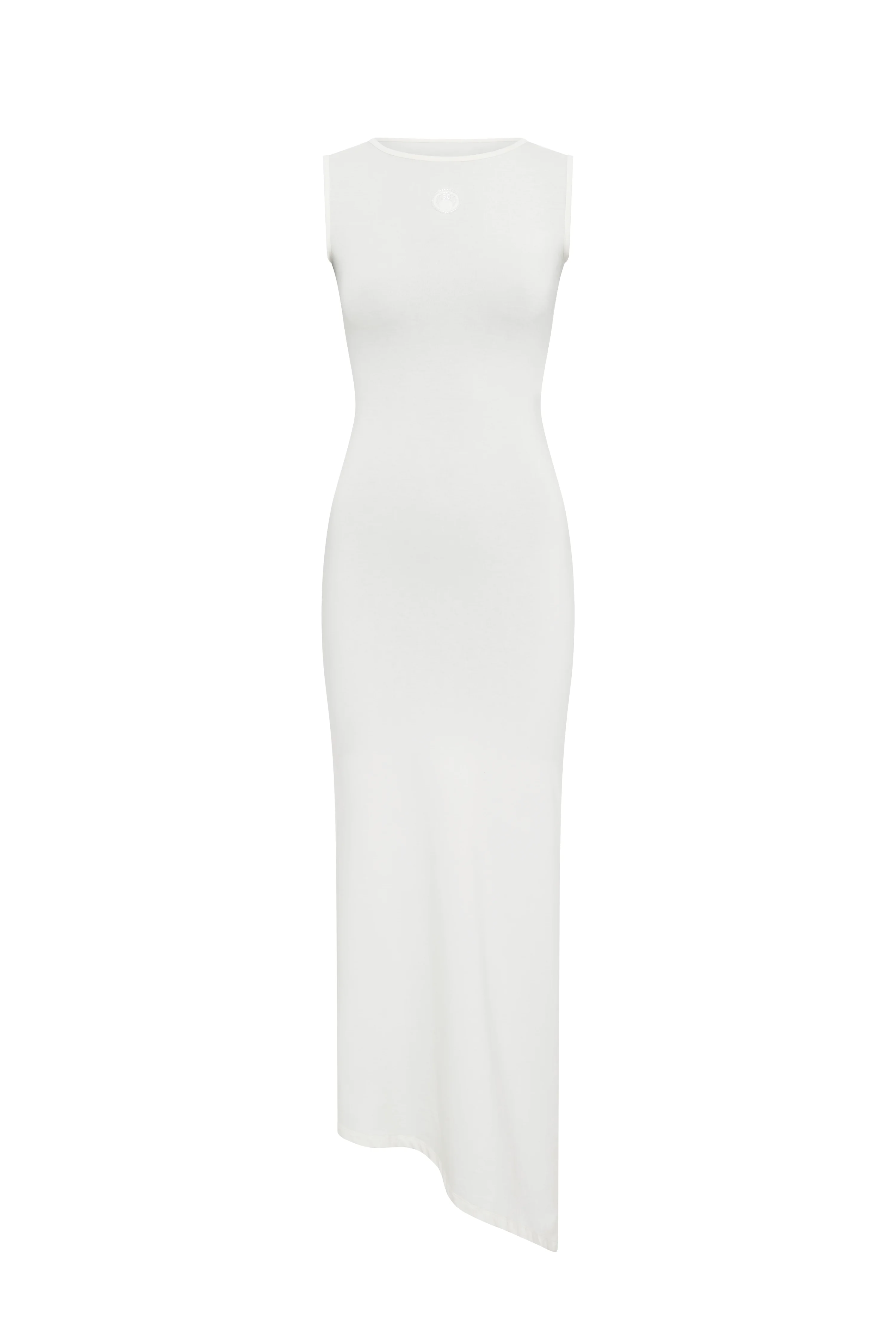 Sleeveless Asymetrical long dress Product Detail - Marine Serre pearl logo on the chest - Soft stretch jersey fabric - Asymmetrical hemline - Long length Composition and Traceability Product details page relating to environmental qualities or characteristics WDR481A_CJER0115_WH10_WHITE Composition : 86% Polyamide, 14% Elastane Traceability: Weaving/Dyeing/Manufacturing: Portugal