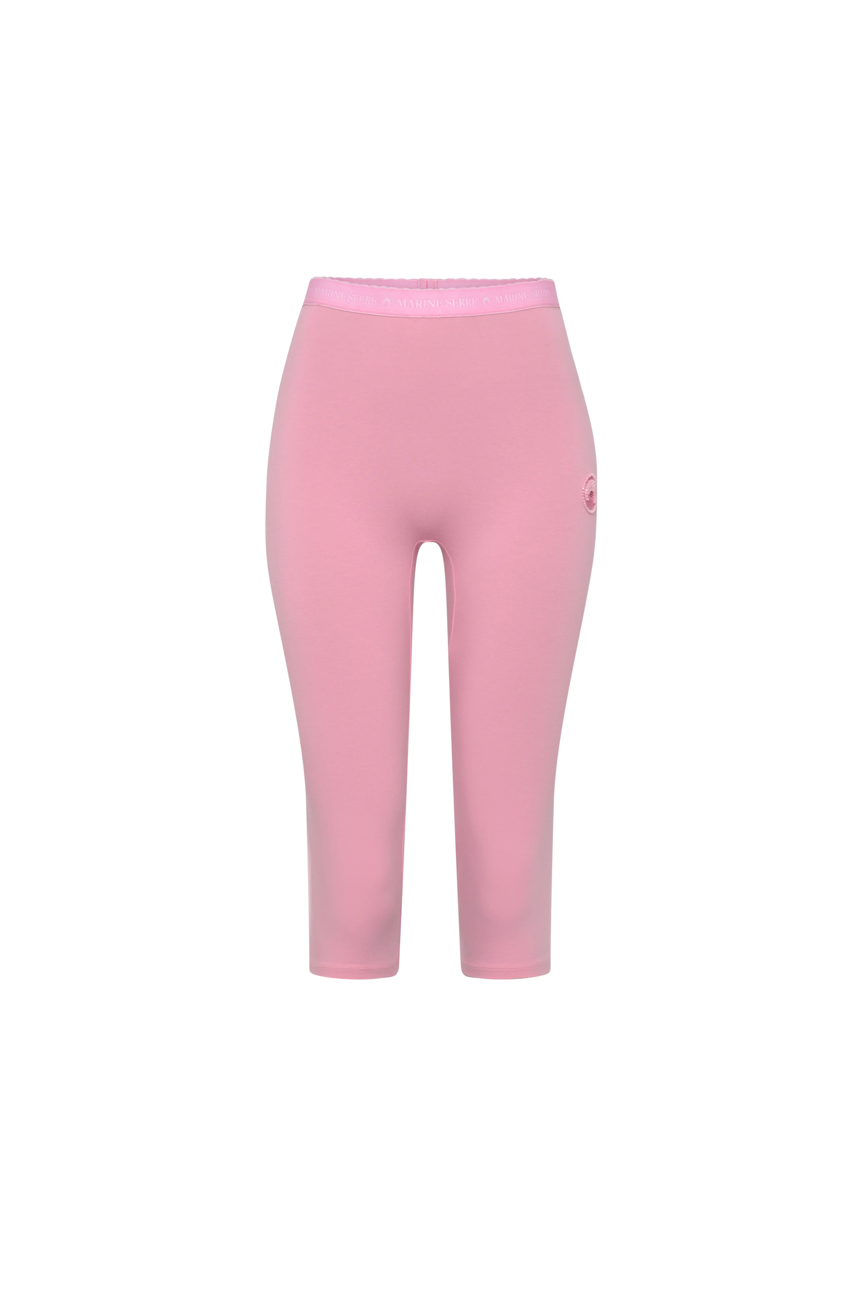 High-waisted knee-length capri Product Detail - Elasticated waistband - Marine Serre pearl logo on the side Composition and Traceability Product details page relating to environmental qualities or characteristics WPA157B_CJER0115_PK30_PINK Composition : 94% Cotton, 6% Elastane Traceability: Weaving/Dyeing/Manufacturing: Portugal