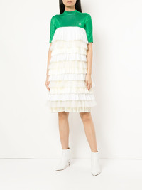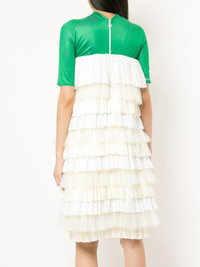 pleated tier color blocked dress Green and white silk-blend pleated tier color blocked dress from marine serre featuring a funnel neck, layers of frills and a pleated design. Imported Composition Viscose 46%, Silk 38%, Polyamide 16% SIZE & FIT Model measurements Height 5 ft 10 in(1.79 m) Bust/Chest 31.49 in(80 cm) Hips 35.03 in(89 cm) Waist 25.19 in(64 cm) Washing instructions Dry Clean Only