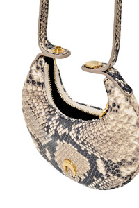 - Zipper closure with Moon engraved puller - Interior in Moon jacquard lining, featuring a foiled logo patch. - Signature Moon charm assembled on side - 14 x 13 x 7 cm - Neck strap : 46 cm drop length Materials Python Printed Leather For this season, our designers took inspiration from the patterns and motifs of rainforest snakes to create a motif that could be applied as a trompe l’oeil to several of our materials. It features soft shades of grey and beige, tones that are omnipresent in this collection. As is usual for many of our trompe l'oeil motifs, the print has been manipulated to curve along the shape of the body, just as if the snakeskin garment was the wearer’s outer skin. 100% Goat Skin