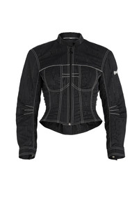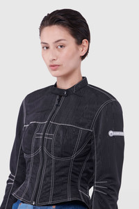 Inspired by motorcycle jackets, this racing jacket in Regenerated Moire is the perfect item to add an edgy flare to an outfit. It features a front zip fastening, long sleeves, an elasticated band in the back, and white topstiches details. A logo patch on the left sleeve reinforces the branded look. Materials Black Moire In Marine Serre’s collections, moire – a wavy-textured jacquard fabric whose artisanal technique used to furnish 17th and 18th century interiors – is employed as a nylon fabric with a psychedelic air and a distinctive shine. Black Classic Moire 62 % Recycled Polyester 38 % Polyester GRS Certified