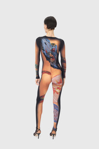 - DRAPED STATUE artwork in trompe l'oeil placement - Reinforced neckline - Cuffs and hem finished with raw edges - Invisible zip in the back Materials Recycled Draped Statue Jersey Trompe l’oeil prints have been one of the tricks in Marine Serre’s playbook since the beginning. The inspiration for this line came from the almost impossibly perfect bodies of statues — think Michaelangelo’s David — which we have recreated as a digital print on our recycled technical jersey. The jersey mesh creates a strong chiaroscuro effect across the garments, as black shadows deepen at the sides of the torso, neck, arms and hems. The prominent abdominal muscles (no gym membership required) add to the sporty-yet-artistic effect, with digitally printed scarves ‘draped’ diagonally across the bust, arms or (in the case of the catsuit and leggings) the crotch and legs. A seasonal tube dress echoes the top half of the crewneck and catsuit but adds a sari-style skirt with florals and netting to underscore the travel cues of the wider collection. The men’s high-neck top also picks up on the netting and is a more minimal club-ready design. 88% Polyamide, 12% Elastane Recycled material: 88% (Polyamide) Releases plastic microfibers into the environment when washing Polyamide is certified GRS.