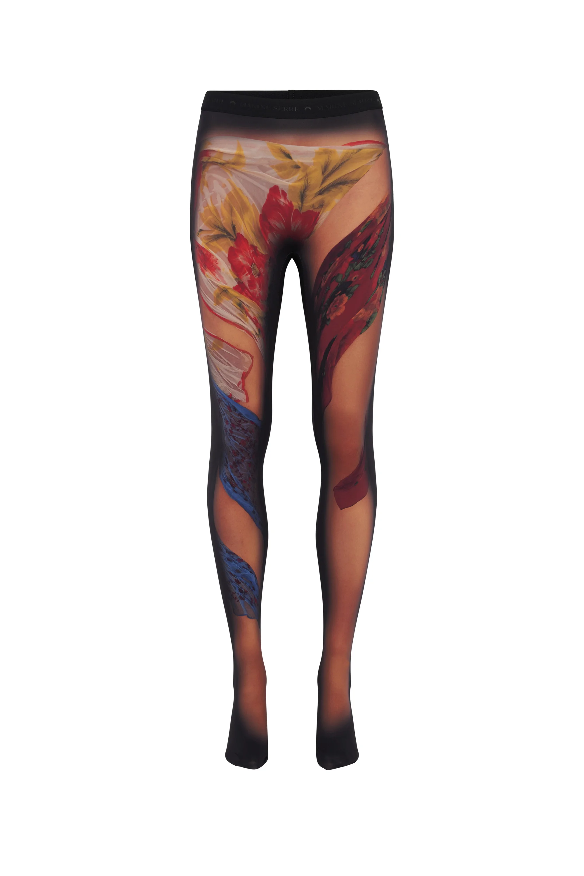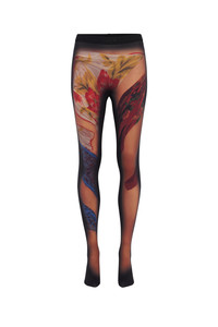 - DRAPED STATUE artwork in trompe l'oeil placement - Elastic waistband Materials Recycled Draped Statue Jersey Trompe l’oeil prints have been one of the tricks in Marine Serre’s playbook since the beginning. The inspiration for this line came from the almost impossibly perfect bodies of statues — think Michaelangelo’s David — which we have recreated as a digital print on our recycled technical jersey. The jersey mesh creates a strong chiaroscuro effect across the garments, as black shadows deepen at the sides of the torso, neck, arms and hems. The prominent abdominal muscles (no gym membership required) add to the sporty-yet-artistic effect, with digitally printed scarves ‘draped’ diagonally across the bust, arms or (in the case of the catsuit and leggings) the crotch and legs. A seasonal tube dress echoes the top half of the crewneck and catsuit but adds a sari-style skirt with florals and netting to underscore the travel cues of the wider collection. The men’s high-neck top also picks up on the netting and is a more minimal club-ready design. 88% Polyamide, 12% Elastane Recycled material: 88% (Polyamide) Releases plastic microfibers into the environment when washing Polyamide is certified GRS.