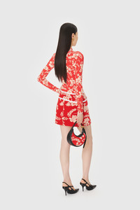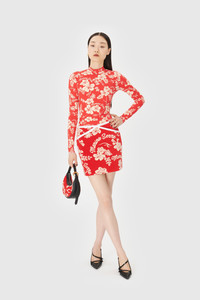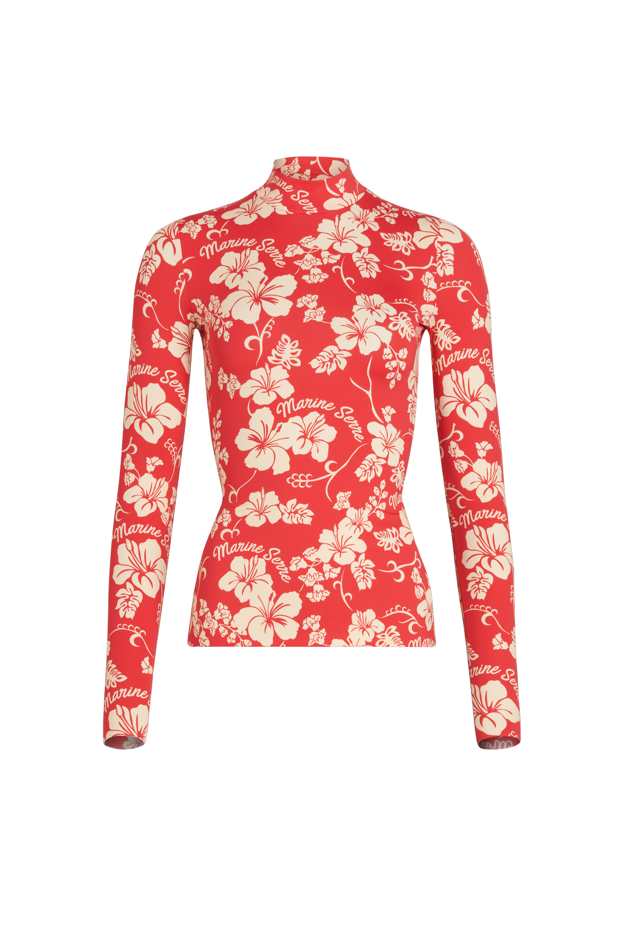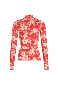 High neck collar Raw edge finishing for cuffs and hem Materials Hawaian Jersey Red 88% Polyamides, 12% Elastane