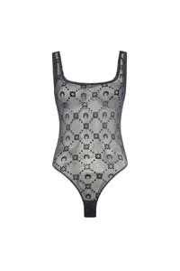 Second-skin bodysuit with an open neck and shoulder straps Product Detail - Signature Moonogram flocked all over - Reinforced neckline and shoulder straps - Adjustable snap-button closing system - Branded label woven on side seam Composition and Traceability Product details page relating to environmental qualities or characteristics WUW061A CJER0005 BK99 BLACK Composition: Base Material: 86% Polyamide, 14% Elastane - Lining: 78% Polyamide, 22% Elastane Recycled material: 86% (Polyamide) Releases plastic microfibers into the environment when washing Traceability: Weaving, Dyeing, Manufacturing: Italy