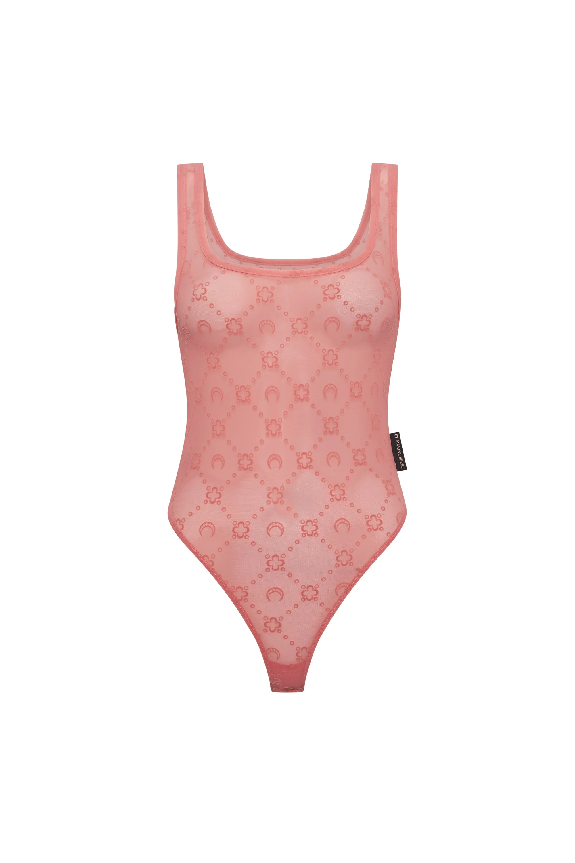 - Reinforced neckline and shoulder straps - Moonogram flock allover - Label with logo on side seam - Adjustable snap-button closing syteme Materials Moonogram Mesh Flock Pink The Moonogram motif is flocked with soft velvet on our recycled mesh jersey, creating an incredibly comfortable fabric. The mesh’s transparency calls back to Marine Serre’s transgressive vision by having a material traditionally used solely for lingerie reimagined as day-to-day wear. 86% Polyamide - Recycled (GRS Certified), 14% Elastane