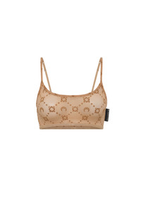 Second skin bralette with spaghetti shoulder straps Product Detail - Signature Moonogram flocked all over - Adjustable elastic straps - Logo stamped on elastic hem Composition and Traceability Product details page relating to environmental qualities or characteristics WUW058A CJER0005 BG60 CAMEL Composition: 86% Polyamide, 14% Elastane Recycled material: 86% (Polyamide) Releases plastic microfibers into the environment when washing Traceability: Weaving, Dyeing, Manufacturing: Italy