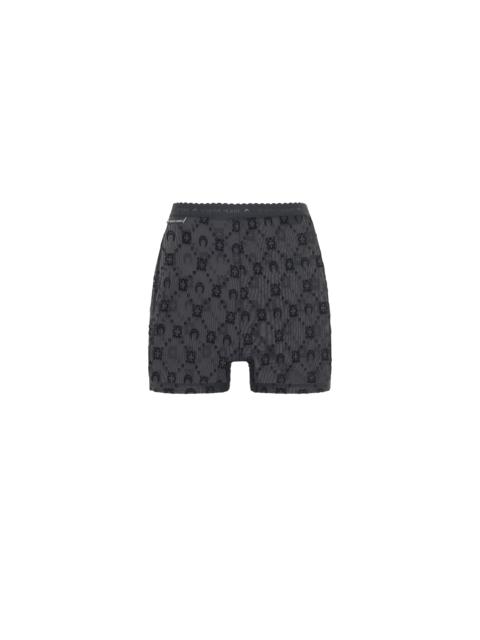 Second-skin high-waisted biker shorts Product Detail - Elastic waistband - Moonogram flock allover - Logo stamped on waistband - Label with logo on front left below elasticated waistband Composition and Traceability Product details page relating to environmental qualities or characteristics WSH012A CJER0005 BK99 BLACK Composition: 86% Polyamide, 14% Elastane Recycled material: 86% (Polyamide) Releases plastic microfibers into the environment when washing Traceability: Weaving/Dyeing: Italy Manufacturing: France