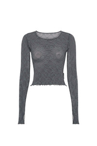 - Signature Moonogram flocked all over - Reinforced neckline - Babylock cuffs and hem - Branded label woven on left side seam Materials Moonogram Mesh Flock Stone Grey The Moonogram motif is flocked with soft velvet on our recycled mesh jersey, creating an incredibly comfortable fabric. The mesh’s transparency calls back to Marine Serre’s transgressive vision by having a material traditionally used solely for lingerie reimagined as day-to-day wear. 86% Polyamide - Recycled (GRS Certified), 14% Elastane